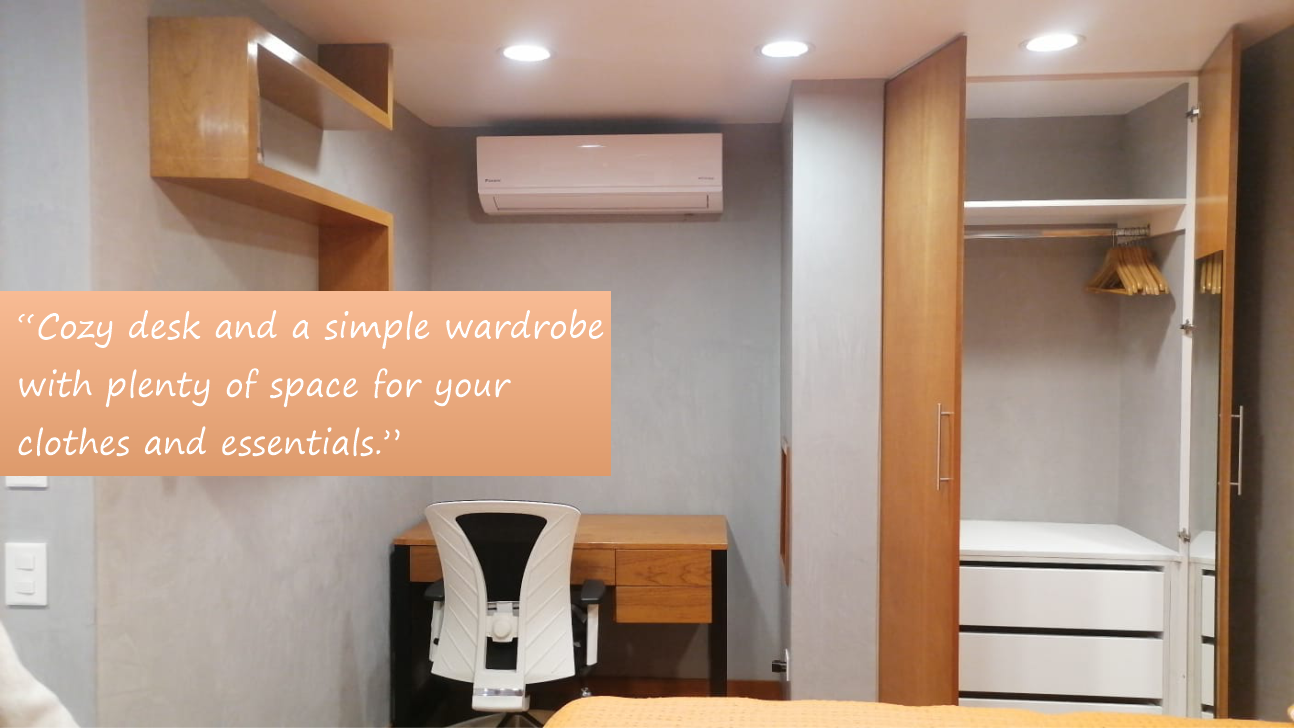 A cozy, well-lit room featuring a comfortable bed with soft linens and pillows. A spacious wardrobe provides ample storage, keeping the room neat and organized, while the overall atmosphere remains calm and welcoming.