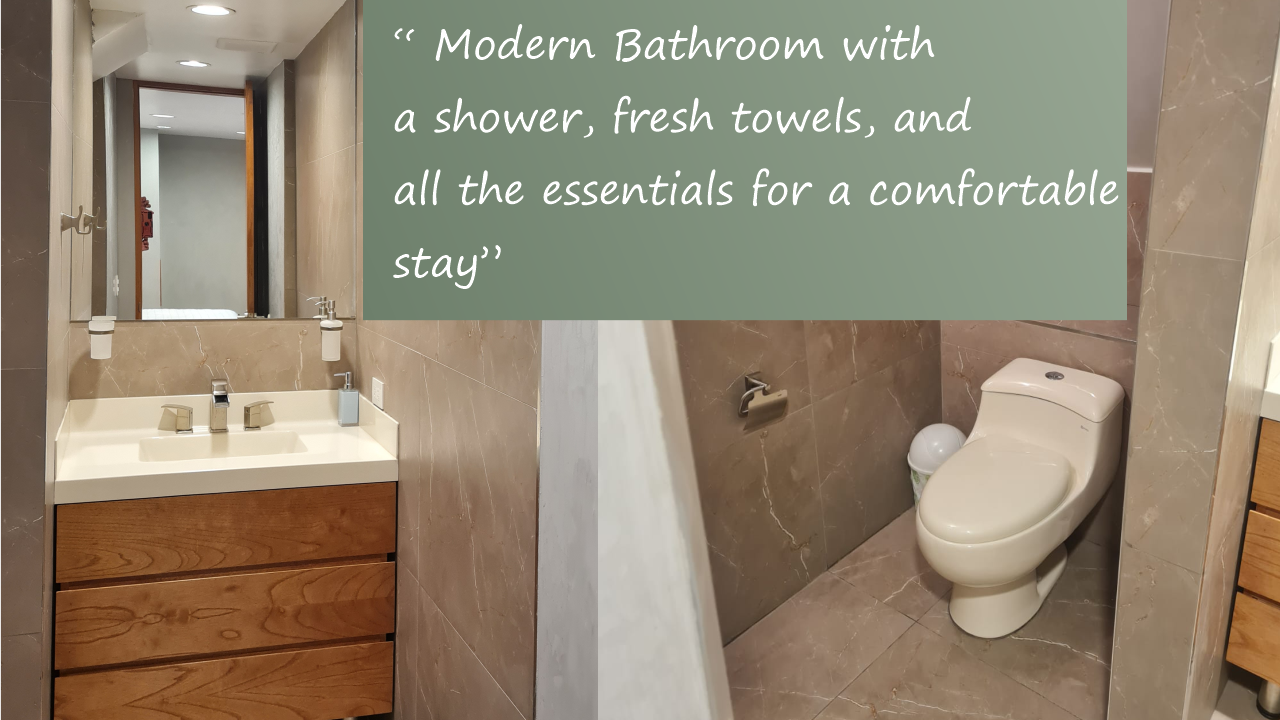 A modern, well-appointed bathroom featuring a polycarbonate sink with a built-in wooden vanity. The space includes a shower with a tempered glass door, a sleek one-piece toilet, and floors and walls fully clad in porcelain tile. Bath towels are provided, combining comfort with a clean, contemporary aesthetic.